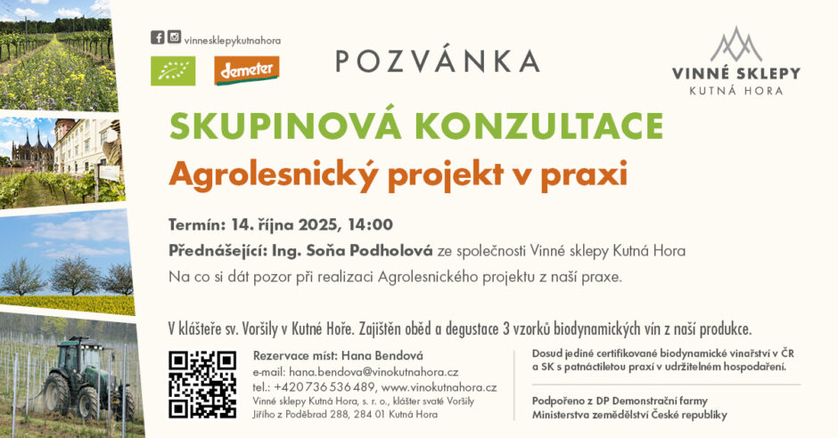 Na přednášku bude navazovat skupinová konzultace o praktických zkušenostech s žádostí o dotaci v rámci programu Agrolesnictví, odehraje se taktéž 14.10.2025, a to od 14:00.