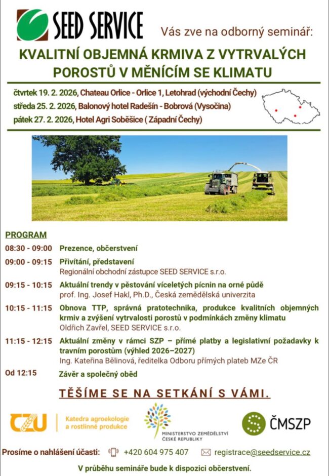 Pozvánka na připravovanou sérii odborných seminářů s názvem „Kvalitní objemná krmiva z vytrvalých porostů v měnícím se klimatu“, které pořádá společnost SEED SERVICE.