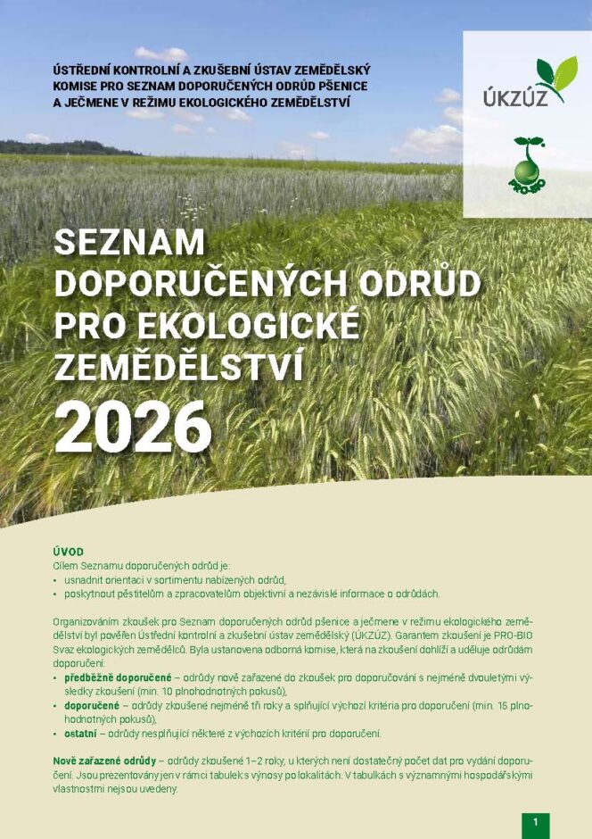 Národní odrůdový úřad ÚKZÚZ ve spolupráci s PRO-BIO Svazem ekologických zemědělců vydal Seznam doporučených odrůd (SDO) ječmene jarního, pšenice jarní a pšenice ozimé pro ekologické zemědělství (EZ), který prezentuje výsledky odrůdového zkoušení ve sklizňových letech 2022-2025.