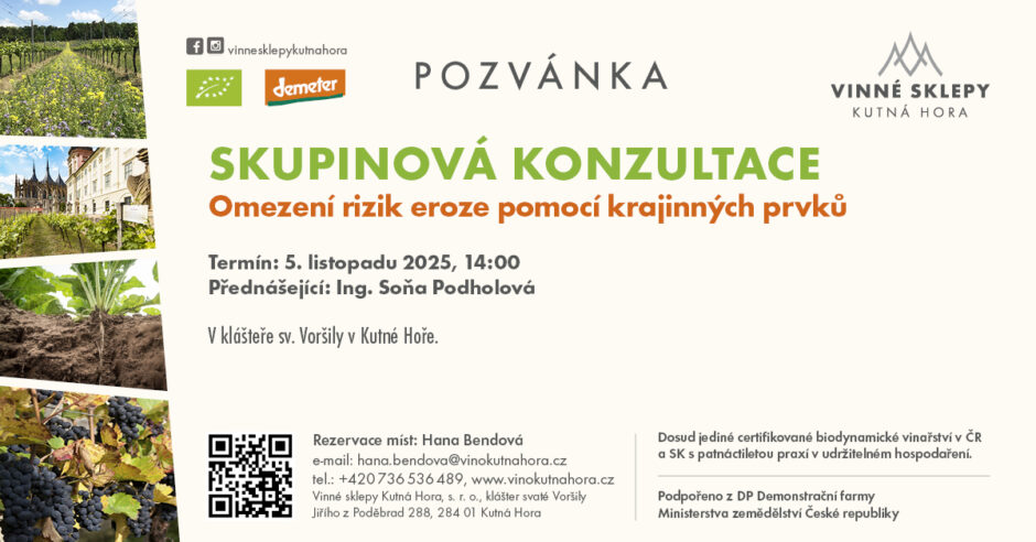 Vinné sklepy Kutná Hora Vás zvou na skupinovou konzultaci určenou pro vinaře, jejichž vinice mohou být ohroženy erozí. Společně projdeme 2 viniční tratě v Kutné Hoře a probereme na praktických ukázkách, jak je možné proti erozi bojovat spoluprací s přírodou.