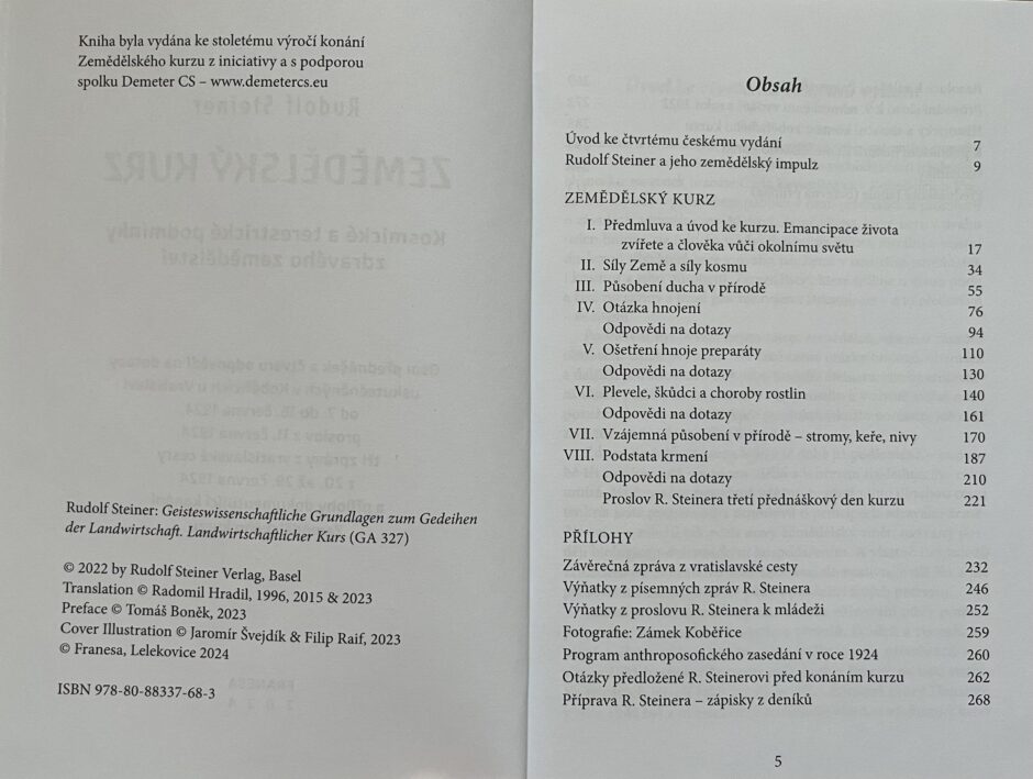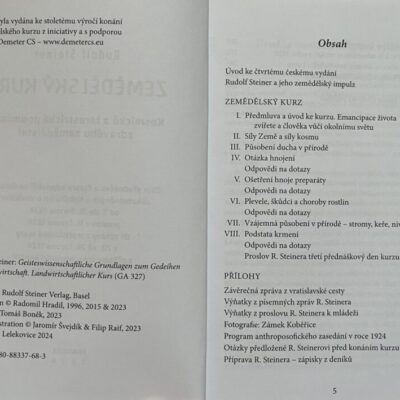 U příležitosti stoletého výročí vychází nové vydání Steinerova Zemědělského kurzu, doplněné o řadu dokumentů, poznámek a vysvětlujících komentářů. Populární cyklus osmi Steinerových zemědělských přednášek předznamenal vznik první zemědělské alternativy – biodynamického zemědělství. Rudolf Steiner v nich z hlediska duchovní vědy vysvětluje princip hnojení rostlin a výživy zvířat, začlenění rostlin mezi Zemi a vesmír, ekologické vztahy v krajině i možnosti homeopatické ochrany rostlin před chorobami a škůdci. Jádrem a srdcem celého kurzu je popis speciálních preparátů k ošetření půdy, rostlin a statkových hnojiv.